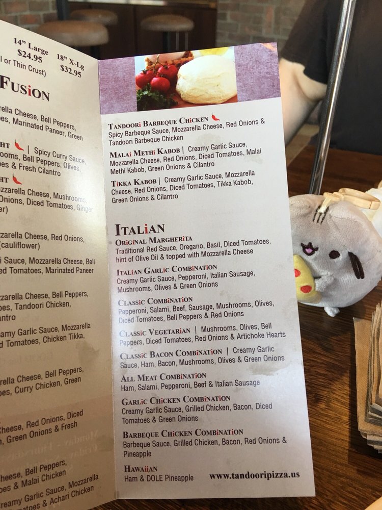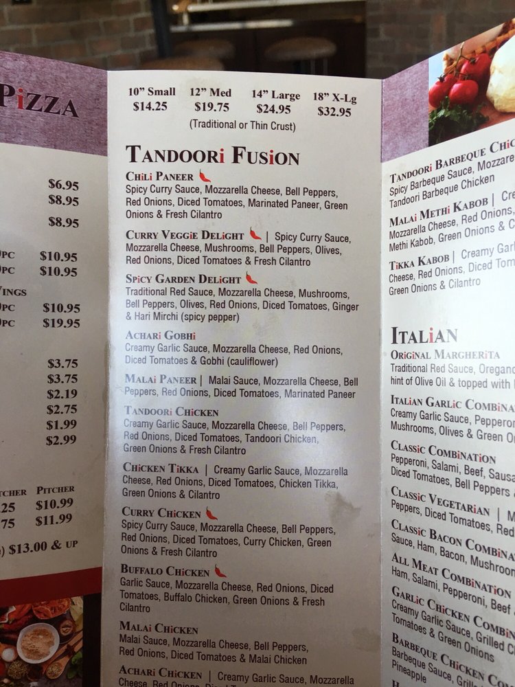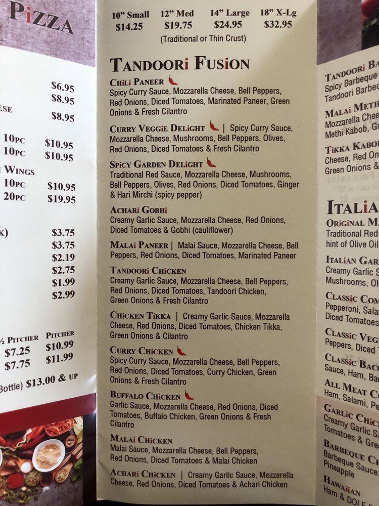 The Chili Paneer and Curry Veggie Delight are standout choices, blending organic spicy curry sauce and mozzarella with savory vegetables. Complement your meal with tasty appetizers like Tandoori Wings or Garlic Sticks W/ Cheese.