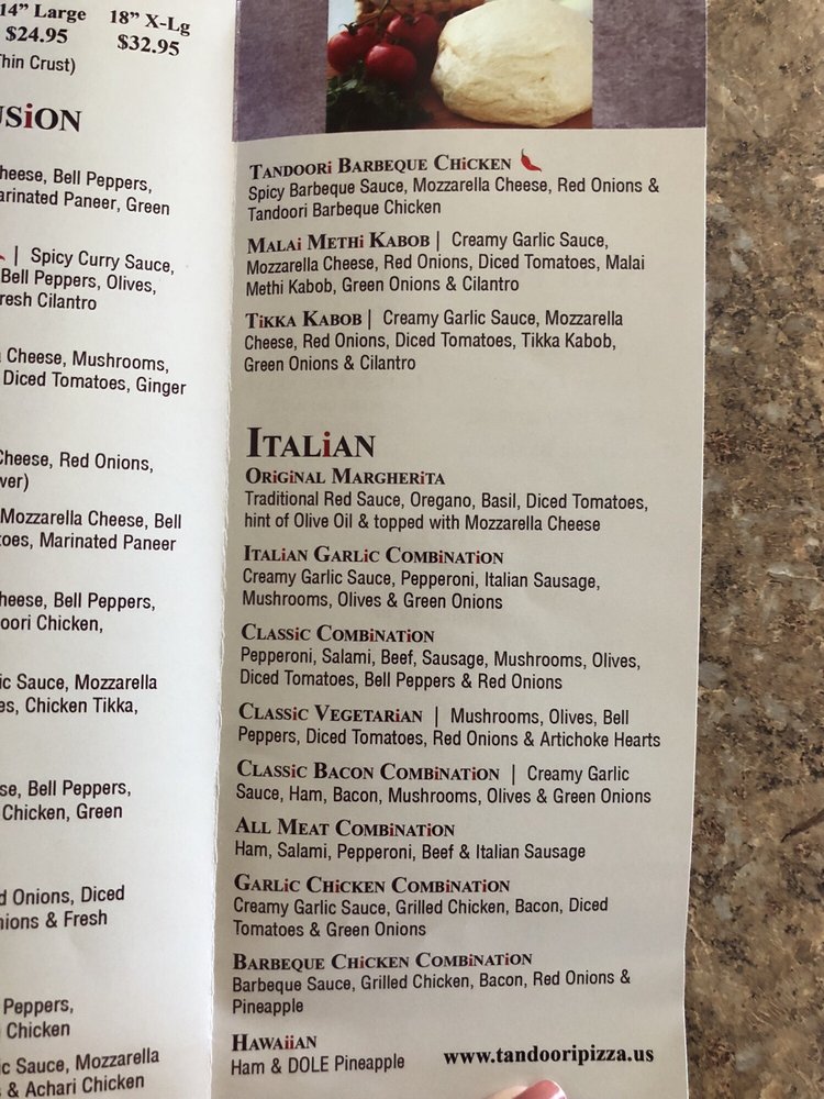 Creamy Garlic Sauce, Mozzarella Cheese, Bell Peppers, Red Onions, Diced Tomatoes, Tandoori Chicken, Green Onions & Fresh Cilantro.